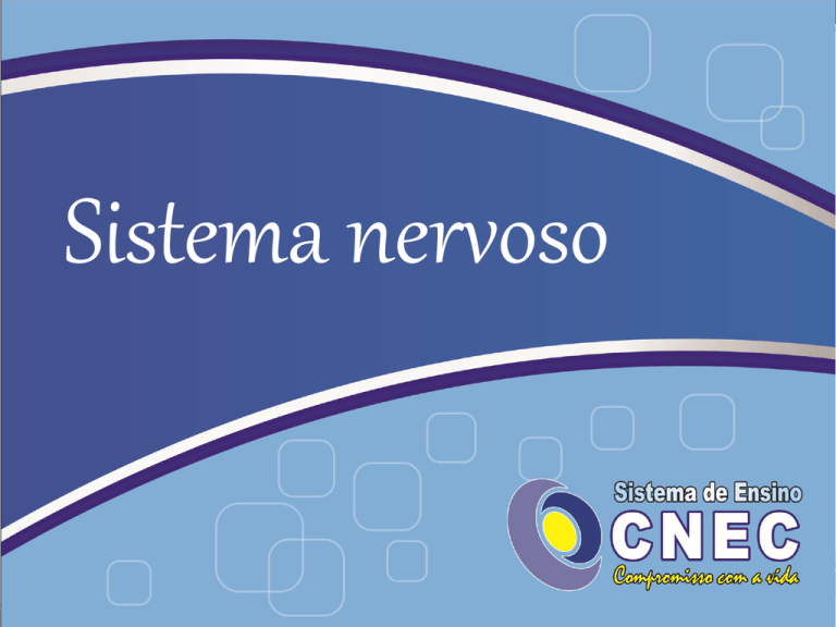 Sistema nervoso Tecido nervoso Disponível em: <http://iahealth.net/wp-content/uploads/2008/12/neurons.jpg>. Acesso em: 17 jun. 2012. Neurônio Disponível em: <http://mycozynook.com/28_02MotorNeuronStruct-L.jpg>. Acesso em: 17 jun. 2012. Neurônio Tipos de neurônios: Neurônio sensitivo ou aferente Neurônio motor ou eferente Neurônio de associação ou interneurônio Disponível em: <http://www.physedandrec.ualberta.ca/en/Research/LaboratoriesandResearchWorksho/~/media/University%20of%20Alberta/ Faculties/PhysEd/Faculty/Images/Labs/neurons735x284.jpg>. Acesso em: 17 jun. 2012. Células da glia ou neuróglia Oligodendrócitos: bainha de mielina no SNC Células de Schwann: bainha de mielina no SNP Astrócitos: transporte de nutrientes e cicatrização Células da micróglia: fagocitose Células ependimárias: produção e reabsorção do líquido cefalorraquidiano Disponível em: <http://academic.kellogg.edu/herbrandsonc/bio201_mckinley/f14-6_cellular_organiza_c.jpg>. Acesso em: 17 jun. 2012. Impulso nervoso Disponível em: <http://www.sciencephoto.com/image/109032/530wm/C0044820-Nerve_impulse,_drawing-SPL.jpg>. Acesso em: 17 jun. 2012. Neurônio em repouso Disponível em: <http://mycozynook.com/28_03RestingPotential-L.jpg>. Acesso em: 17 jun. 2012. Impulso nervoso Lei do tudo ou nada Disponível em: <http://mycozynook.com/28_05NerveImpulse_3-L.jpg>. Acesso em: 17 jun. 2012. Disponível em: <http://www.tiem.utk.edu/~gross/bioed/webmodules/synapsegraph.gif>. Acesso em: 19 jun. 2012. Impulso nervoso Disponível em: <http://antranik.org/wp-content/uploads/2012/04/conduction-in-a-myelinated-nerve-fiber-saltatory-conduction.jpg>. Acesso em: 17 jun. 2012. Sinapse Neurotransmissores: Acetilcolina Noradrenalina Serotonina Dopamina Disponível em: <http://mycozynook.com/28_06aNeuronCommunicat-L.jpg>. Acesso em: 17 jun. 2012. Sistema nervoso Disponível em: <http://files.forensicmed.webnode.com/200000063-e4eeae5e85/Rembrandt_Harmensz._van_Rijn_008.jpg>. Acesso em: 26 jun. 2012. Divisão do sistema nervoso Sistema nervoso central Encéfalo Medula espinhal Sistema nervoso periférico Nervos cranianos ou encefálicos Gânglios (corpos celulares) Nervos espinhais ou raquidianos Disponível em: <http://mycozynook.com/28_11aVertebrateNervSys-L.jpg>. Acesso em: 17 jun. 2012. Proteção Sistema nervoso central Caixa craniana e coluna vertebral Meninges • Dura-máter, aracnoide e piamáter • Líquor ou líquido cérebroespinhal ou líquido cefalorraquidiano (entre aracnoide e pia-máter) Disponível em: <http://www.sciencephoto.com/image/302587/530wm/P1160846-Human_backbone,_artwork-SPL.jpg>. Acesso em: 26 jun. 2012. Disponível em: <http://meningitissymptomsare.com/wp-content/uploads/viral-meningitis-in-adults.jpg>. Acesso em: 26 jun. 2012. Sistema nervoso central Cérebro ou telencéfalo Prosencéfalo Diencéfalo (tálamo e hipotálamo) Mesencéfalo Metencéfalo (ponte e cerebelo) Mielencéfalo (bulbo) Medula espinhal Disponível em: <http://upload.wikimedia.org/wikipedia/commons/b/b2/Encephalon.png>. Acesso em: 27 jun. 2012. Rombencéfalo Cérebro ou telencéfalo Encéfalo Hemisférios cerebrais unidos pelo corpo caloso Circunvoluções cerebrais Disponível em: <http://www.umm.edu/graphics/images/en/8753.jpg>. Acesso em: 27 jun. 2012. Cérebro ou telencéfalo Encéfalo Substância cinzenta = corpos celulares (córtex) Substância branca = axônios (interna) Memória, inteligência, processamento de informações (visão, audição, olfato, paladar e fonação) Disponível em: <http://www.live-in-green.com/features/images/ul_brain_cross_section.jpg>. Acesso em: 27 jun. 2012. Disponível em: <http://www.visualphotos.com/photo/1x7465492/human_brain_-_cross_section_5w5188.jpg>. Acesso em: 27 jun. 2012. Diencéfalo Encéfalo Tálamo • Via de passagem de impulsos nervosos do córtex para a periferia e vice-versa Hipotálamo • Homeostase (temperatura corporal, fome, sede, atividade da hipófise) Disponível em: <http://bodybits.tripod.com/brain.gif>. Acesso em: 27 jun. 2012. Mesencéfalo Encéfalo Tônus muscular e postura corporal Sono e vigília Filtra e seleciona as informações transmitidas ao cérebro Disponível em: <http://www.pc.maricopa.edu/Biology/pfinkenstadt/BIO201/201LessonBuilder/UnitFour/CNS/midbrain.jpg>. Acesso em: 27 jun. 2012. Metencéfalo Encéfalo Ponte • Cruzamento das fibras nervosas que ligam o cérebro à medula Cerebelo • Coordenação motora • Equilíbrio Bulbo (medula oblonga) Atividades vitais autônomas (respiração, digestão, batimentos cardíacos) Disponível em: <http://www.cerebronosso.bio.br/storage/DivisoesPrincipais-MedialTelDiencTroncoCb3.jpg?__SQUARESPACE_CACHEVERSION=1266428886206>. Acesso em: 27 jun. 2012. Medula espinhal Transmite informações até o encéfalo Elabora respostas simples e rápidas (atividades reflexas) Disponível em: <http://www.sci-recovery.org/images/vertebraeandspinalcord.jpg>. Acesso em: 27 jun. 2012. Acervo CNEC. Ato reflexo e arco reflexo Disponível em: <http://ivyanatomy.com/images/reflex%20arc%20labeled.JPG>. Acesso em: 27 jun. 2012. Ato reflexo e arco reflexo Disponível em: <http://mycozynook.com/28_01bKneeJerkReflex-L.jpg>. Acesso em: 17 jun. 2012. Ato reflexo e arco reflexo Disponível em: <http://academic.kellogg.edu/herbrandsonc/bio201_mckinley/f16-13_monosynaptic_and_c.jpg>. Acesso em: 27 jun. 2012. Sistema nervoso periférico Nervos e gânglios 12 pares de nervos cranianos (3 sensoriais, 5 motores e 4 mistos) 31 pares de nervos espinhais (mistos) Divisão Somático • Inerva musculatura esquelética voluntário Autônomo • Inerva musculatura lisa e estriada cardíaca involuntário • Simpático e parassimpático Nervos cranianos Disponível em: <http://media-2.web.britannica.com/eb-media/44/54244-004-892C5169.jpg>. Acesso em: 27 jun. 2012. Sistema nervoso periférico autônomo Simpático Neurotransmissor: noradrenalina Ativa em situações de estresse e de fuga prepara o corpo para a ação Gânglios próximos 