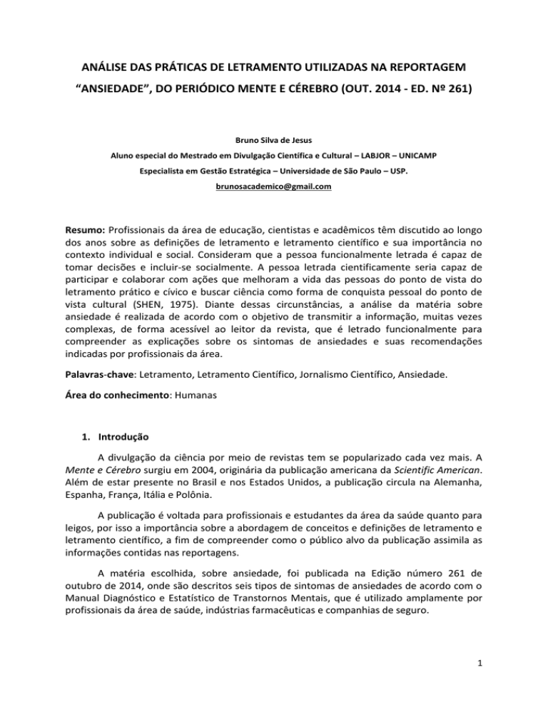 ANÁLISE DAS PRÁTICAS DE LETRAMENTO UTILIZADAS NA REPORTAGEM AN“IEDADE , DO PERIÓDICO MENTE E CÉREBRO (OUT. 2014 - ED. Nº 261) Bruno Silva de Jesus Aluno especial do Mestrado em Divulgação Científica e Cultural – LABJOR – UNICAMP Especialista em Gestão Estratégica – Universidade de São Paulo – USP. [email protected] Resumo: Profissionais da área de educação, cientistas e acadêmicos têm discutido ao longo dos anos sobre as definições de letramento e letramento científico e sua importância no contexto individual e social. Consideram que a pessoa funcionalmente letrada é capaz de tomar decisões e incluir-se socialmente. A pessoa letrada cientificamente seria capaz de participar e colaborar com ações que melhoram a vida das pessoas do ponto de vista do letramento prático e cívico e buscar ciência como forma de conquista pessoal do ponto de vista cultural (SHEN, 1975). Diante dessas circunstâncias, a análise da matéria sobre ansiedade é realizada de acordo com o objetivo de transmitir a informação, muitas vezes complexas, de forma acessível ao leitor da revista, que é letrado funcionalmente para compreender as explicações sobre os sintomas de ansiedades e suas recomendações indicadas por profissionais da área. Palavras-chave: Letramento, Letramento Científico, Jornalismo Científico, Ansiedade. Área do conhecimento: Humanas 1. Introdução A divulgação da ciência por meio de revistas tem se popularizado cada vez mais. A Mente e Cérebro surgiu em 2004, originária da publicação americana da Scientific American. Além de estar presente no Brasil e nos Estados Unidos, a publicação circula na Alemanha, Espanha, França, Itália e Polônia. A publicação é voltada para profissionais e estudantes da área da saúde quanto para leigos, por isso a importância sobre a abordagem de conceitos e definições de letramento e letramento científico, a fim de compreender como o público alvo da publicação assimila as informações contidas nas reportagens. A matéria escolhida, sobre ansiedade, foi publicada na Edição número 261 de outubro de 2014, onde são descritos seis tipos de sintomas de ansiedades de acordo com o Manual Diagnóstico e Estatístico de Transtornos Mentais, que é utilizado amplamente por profissionais da área de saúde, indústrias farmacêuticas e companhias de seguro. 1 2. Objetivos Apresentar os conceitos de Letramento, Letramento Científico, e analisar as informaçõesàdaà epo tage àso eà a siedade àdoàpe iódi oàMente e Cérebro de acordo com a identidade da revista e sua pluralidade e também conforme a proposta de apresentar informações de forma acessível ao leitor. 3. Materiais e Métodos Para a elaboração deste trabalho, foi realizada pesquisa na internet e na literatura especializada. Para coleta de dados, optou-se por ferramentas de busca de periódicos e bibliotecas virtuais, além do site específico da Mente e Cérebro e a Edição 261 de Outubro de 2014. 4. Conceitos e Definições de Letramento Segundo ABREU e BRITO (2003), o termo Letramento foi introduzido no Brasil a partir doàte oà e à i gl sà Lite a ,à oà ualà e aàt aduzidoà o oàalfa etizaç o.à Devidoà aosà ovosà sentidos adquiridos e às novas compreensões de Literacy, foi necessário adequar o termo para letramento. Portanto, é possível afirmar que a formulação e aplicação aos novos conceitos resultaram de necessidades teóricas e práticas várias, em função dos avanços na maneira de compreensão das relações inter-humanas, dos processos de participação social e do acesso à construção de conhecimento. De acordo com KLEIMAN (1991) o conceito de letramento começou a ser usado nos meios acadêmicos numa tentativa de separar os estudos sobre o "impacto social da escrita" dos estudos sobre a alfabetização. KLEIMAN (1995) afirma que a escola, como a mais importante das agências de letramento, exclui a preocupação de letramento como prática social e foca apenas na prática de letramento como alfabetização. Letramento é o conjunto de práticas que denotam a capacidade de uso de diferentes tipos de material escrito. Para HILGERT (2000), o letramento abrange o uso de textos escritos também numa gradação que vai desde uma escrita formal de um texto acadêmico até uma escrita mínima que incorpora procedimentos próprios da prática social da fala. Segundo GRAFF (1987), letramento é uma tecnologia ou conjunto de técnicas usadas para a comunicação e para a decodificação e reprodução de materiais escritos ou impressos. As tentativas de definição de letramento se baseiam em duas concepções de letramento: Atributo dos indivíduos: Descrever habilidades individuais adquiridas através do letramento. Para SOARES (2010), no ponto de vista da dimensão individual de letramento, a leitura é um conjunto de habilidades linguísticas e psicológicas, que se estendem desde habilidades de decodificar palavras escritas até a capacidade de compreender textos escritos. A autora explica que a escrita também é um conjunto de habilidades linguísticas e psicológicas como a capacidade de registrar unidades de som e transmitir significado a leitores. A escrita também é um processo de transmitir ideias e organizar o pensamento em língua escrita; 2 Fenômeno social: Apresenta letramento como produto de transmissão cultural. De acordo com SOARES (2010), na dimensão social, letramento é o que as pessoas fazem com as habilidades de leitura e escrita, em um contexto específico, e como essas habilidades se relacionam com as necessidades, valores e práticas sociais. STREET (1984) propôs um modelo de letramentos, que enfatiza o contexto social de práticas como escrita e leitura e o papel das pessoas comuns que fazem usos desses aprendizados. Com base nas duas concepções de letramento, SOARES (2010) permite concluir que o conceito de letramento envolve um conjunto de fatores que variam de habilidades e