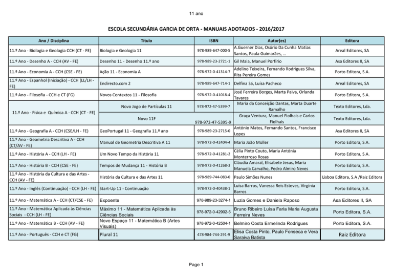 11 ano ESCOLA SECUNDÁRIA GARCIA DE ORTA - MANUAIS ADOTADOS - 2016/2017 Ano / Disciplina Título ISBN Autor(es) A.Guerner Dias, Osório Da Cunha Matias 978-989-647-000-5 Santos, Paula Guimarães, … 11.º Ano - Biologia e Geologia CCH (CT - FE) Biologia e Geologia 11 11.º Ano - Desenho A - CCH (AV - FE) Desenho 11 - Desenho 11.º ano 978-989-23-2721-1 Gil Maia, Manuel Porfírio 11.º Ano - Economia A - CCH (CSE - FE) Ação 11 - Economia A 978-972-0-41314-7 11.º Ano - Espanhol (Iniciação) - CCH (LL/LH FE) Endirecto.com 2 978-989-647-714-1 Delfina Sá, Luísa Pacheco 11.º Ano - Filosofia - CCH e CT (FG) Novos Contextos 11 - Filosofia Novo Jogo de Partículas 11 11.º Ano - Física e Química A - CCH (CT - FE) Novo 11F Adelino Teixeira, Fernando Rodrigues Silva, Rita Pereira Gomes José Ferreira Borges, Marta Paiva, Orlanda Tavares Maria da Conceição Dantas, Marta Duarte 978-972-47-5399-7 Ramalho Graça Ventura, Manuel Fiolhais e Carlos Fiolhais 978-972-47-5395-9 António Matos, Fernando Santos, Francisco 978-989-23-2715-0 Lopes 978-972-0-41018-4 11.º Ano - Geografia A - CCH (CSE/LH - FE) GeoPortugal 11 - Geografia 11.º ano 11.º Ano - Geometria Descritiva A - CCH (CT/AV - FE) Manual de Geometria Descritiva A 11 978-972-0-42404-4 Maria João Müller 11.º Ano - História A - CCH (LH - FE) Um Novo Tempo da História 11 978-972-0-41281-2 11.º Ano - História B - CCH (CSE - FE) Tempos de Mudança 11 - História B 11.º Ano - História da Cultura e das Artes CCH (AV - FE) História da Cultura e das Artes 11 Célia Pinto Couto, Maria Antónia Monterroso Rosas Cláudia Amaral, Elisabete Jesus, Maria 978-972-0-41268-3 Manuela Carvalho, Pedro Almiro Neves 978-989-744-083-0 Paulo Simões Nunes Luísa Barros, Vanessa Reis Esteves, Virgínia Barros 11.º Ano - Inglês (Continuação) - CCH (LH - FE) Start-Up 11 - Continuação 978-972-0-40438-1 11.º Ano - Matemática A - CCH (CT/CSE - FE) Expoente 978-989-23-3274-1 Luzia Gomes e Daniela Raposo 11.º Ano - Matemática Aplicada às Ciências Sociais - CCH (LH - FE) Máximo 11 - Matemática Aplicada às Ciências Sociais Novo Espaço 11 - Matemática B (Artes Visuais) 11.º Ano - Matemática B - CCH (AV - FE) 11.º Ano - Português - CCH e CT (FG) Plural 11 978-972-0-42902-5 Bruno Ribeiro Luísa Faria Maria Augusta Ferreira Neves 978-972-0-42504-1 Belmiro Costa Ermelinda Rodrigues 478-984-744-291-9 Page 1 Elisa Costa Pinto, Paulo Fonseca e Vera Saraiva Batista Editora Areal Editores, SA Asa Editores II, SA Porto Editora, S.A. Areal Editores, SA Porto Editora, S.A. Texto Editores, Lda. Texto Editores, Lda. Asa Editores II, SA Porto Editora, S.A. Porto Editora, S.A. Porto Editora, S.A. Lisboa Editora, S.A /Raiz Editora Porto Editora, S.A. Asa Editores II, SA Porto Editora, S.A. Porto Editora, S.A. Raiz Editora