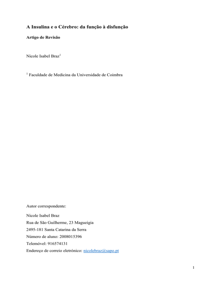 A Insulina e o Cérebro: da função à disfunção Artigo de Revisão Nicole Isabel Braz1 1 Faculdade de Medicina da Universidade de Coimbra Autor correspondente: Nicole Isabel Braz Rua de São Guilherme, 23 Magueigia 2495-181 Santa Catarina da Serra Número de aluno: 2008015396 Telemóvel: 916574131 Endereço de correio eletrónico: [email protected] 1 ÍNDICE Resumo ....................................................................................................................................... 4 Abstract ...................................................................................................................................... 6 Lista de Abreviaturas ................................................................................................................. 8 Introdução................................................................................................................................. 10 Materiais e Métodos ................................................................................................................. 12 Recetores de Insulina no Cérebro............................................................................................. 12 A Origem da Insulina no Cérebro: Central Versus Periférica .................................................. 14 Origem Periférica ................................................................................................................. 14 Origem Central ..................................................................................................................... 16 Funções da Insulina no SNC .................................................................................................... 17 Metabolismo energético, Ingestão Alimentar e Controlo de Peso ....................................... 17 Reprodução........................................................................................................................... 19 Cognição, memória e aprendizagem .................................................................................... 20 Neuromodelação, Neuroproteção e Crescimento Neuronal ................................................. 24 Disfunções Centrais da Insulina ............................................................................................... 29 Doenças Neurodegenerativas ............................................................................................... 29 Depressão ............................................................................................................................. 36 Discussão e Conclusão ............................................................................................................. 37 Agradecimentos ........................................................................................................................ 39 Referências ............................................................................................................................... 40 2 ÍNDICE DE TABELAS Tabela 1 Resumo das Funções da Insulina Central…………………………………………...28 ÍNDICE DE FIGURAS Figura 1 A estrutura da insulina……………………………………………………………...10 Figura 2 A insulina atravessa a BHE através de um sistema de transportadores……………15 Figura 3 Prevalência da DM e da Hiperglicemia Intermédia em Portugal-2013…………….29 Figura 4 Associação entre alterações da sinalização da insulina e a fisiopatologia da Doença de Alzheimer………………………………………………………………………………….34 3 RESUMO A insulina é uma hormona produzida e segregada pelas células β-pancreáticas, conhecida historicamente pelo seu papel na homeostasia da glicose. No entanto, tem-se verificado um crescente interesse pelas suas funções a nível do sistema nervoso central. O objetivo desta tese foi reunir e rever a literatura científica atual sobre as fontes da insulina existente no cérebro, as suas funções, as consequências da sua disfunção e o seu papel no desenvolvimento de doenças neuropsiquiátricas. Verificou-se que, apesar da aquisição de glicose no cérebro ser independente da insulina, os recetores desta hormona estão presentes no sistema nervoso central. Ainda não existe um consenso quanto à origem da insulina a nível cerebral, admitindo-se uma origem central, uma origem periférica com passagem pela barreira hematoencefálica, ou a associação de ambas. Observou-se que a insulina apresenta várias funções a nível do sistema nervoso central, nomeadamente a nível do metabolismo energético. A insulina central inibe a neoglicogénese hepática, provoca uma diminuição na ingestão alimentar e uma perda de peso. Esta hormona também apresenta um papel relevante na reprodução, ao estimular a libertação de GnRH pelo hipotálamo. Verificou-se também que a insulina apresenta uma função neuromodeladora importante, nomeadamente na transmissão glutaminérgica, GABAérgica, noradrenérgica e colinérgica, interferindo por isso em processos cognitivos e de memória. Esta hormona apresenta propriedades neuroprotetoras importantes: inibe a apoptose, minora os efeitos deletérios do stress oxidativo e da isquemia e diminui a toxicidade decorrente da acumulação do peptídeo β-amilóide. Talvez por isso, disfunções centrais da insulina estejam relacionadas com o desenvolvimento de doenças neurodegenerativas e psiquiátricas. Confirmou-se que a doença de Alzheimer apresenta vários mecanismos fisiopatológicos comuns à diabetes mellitus, nomeadamente processos inflamatórios e resistência à insulina, levando a uma maior 4 acumulação β-amilóide, aumento da formação de tranças neurofibrilares e deterioração sináptica. Além desta, existem muitas patologias neuropsiquiátricas (como a doença de Parkinson, doença de Huntington e depressão) em que dist